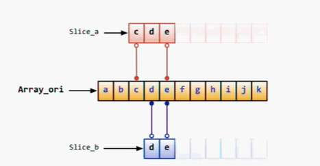 array =[a,b,c,d,e,f]slice_a[2:5] // [c,d,e]slice_b :=slice_a[1:3] // [d,e]可以取超過slice的個數,即便是從slice_a切的,因為實現的是底層數組slice_b :=slice_a[3:5] //[def]